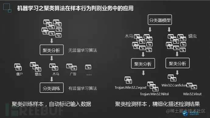 在虚拟化沙箱中诱导恶意代码展现并记录恶意行为后,使用AI建模分析方法可以使用机器学习算法,对样本在虚拟执行环境中的各种行为进行威胁判定。