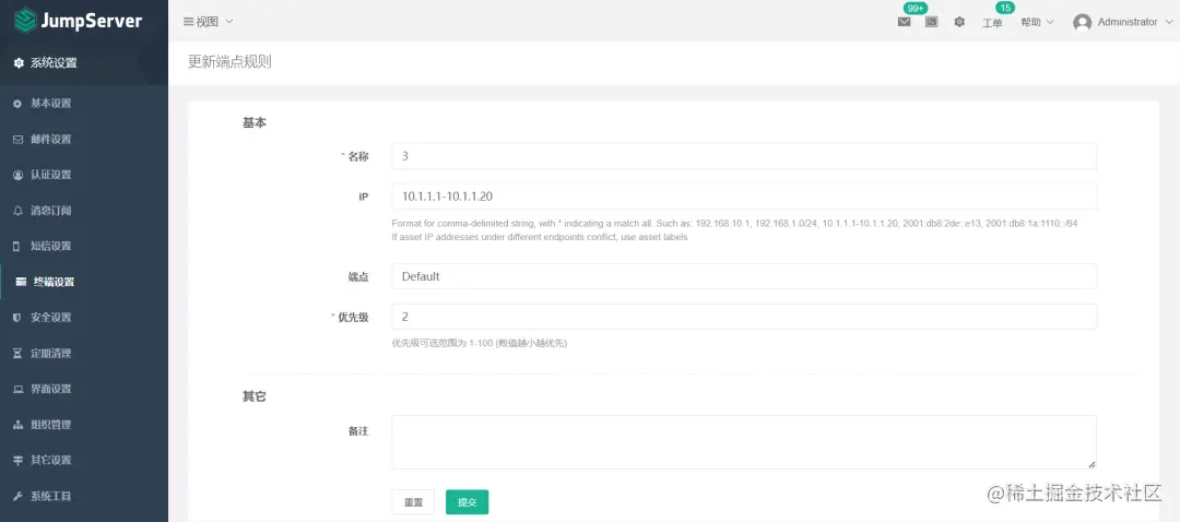 JumpServer还支持服务端点的规则配置,可以针对指定资产指定固定的访问节点。服务端点是用户访问服务的地址(端口),当用户在线连接资产时,系统会根据端点规则和资产标签选择相应的服务端点作为访问入口建立连接,从而实现分布式资产连接。