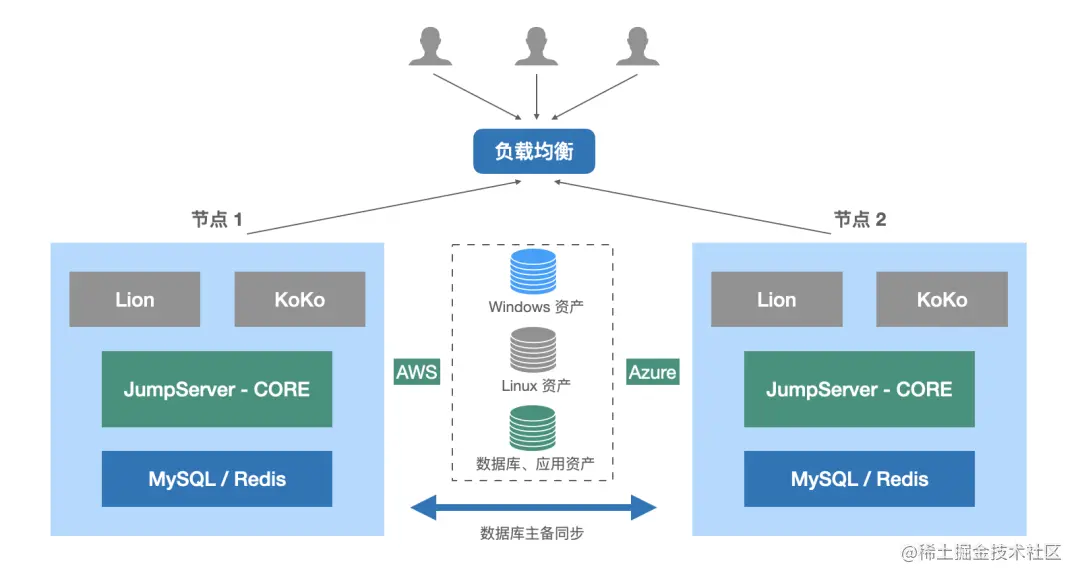 这一部署架构对外提供统一域名,通过前端负载均衡设备,对用户的请求进行分发,实现负载均衡,同时对后端节点进行自动检测。除了应用高可用外,MySQL、Reids均采用了高可用的部署方式,以确保数据库服务不宕机、数据不丢失。这样的部署架构在满足堡垒机服务高可用的同时,也可以灵活应对公司资产数量和用户并发数持续增长的情况。