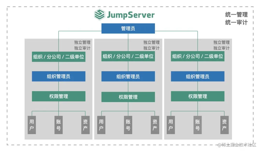 JumpServer支持多租户管理,通过划分组织进行组织间资源与权限的隔离,从而实现不同组织的独立管理、独立审计。在统一管理、统一审计的前提下,管理员针对公司不同的业务部门进行组织划分,并为各组织单独设置组织管理员,由组织管理员对各组织内的成员进行资产授权和权限划分,大幅提升了运维管理的效率;