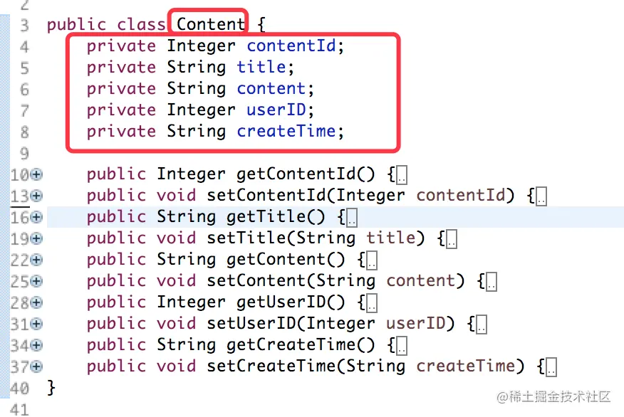 根据上述cotent表中的字段,我们来创建该表所对应的model类。下方这个Content类就是我们所创建的content表所对应的Model。具体如下所示。