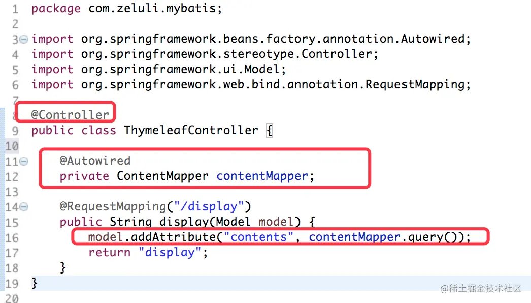 紧接着,我们就来创建模板所对应的Controller,如下所示。下方我们依然使用注入的ContentMapper对象来获取数据。然后将获取的数据添加到model对象中,在添加时,我们会为该数据对象指定一个参数名称,如下方的"contents"。然后返回模板页面即可,下方的“display”就是我们模板页面所在的文件名称。
