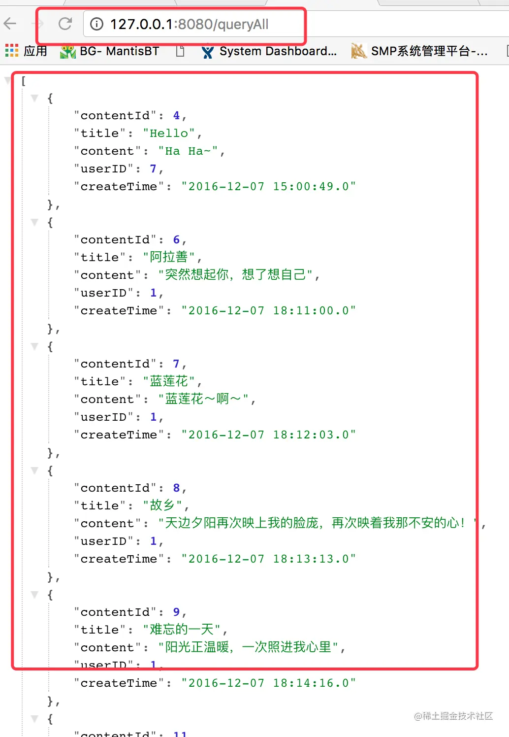 接下来我们来查询一下所有的数据,也就是访问queryAll路由。具体结果如下所示。