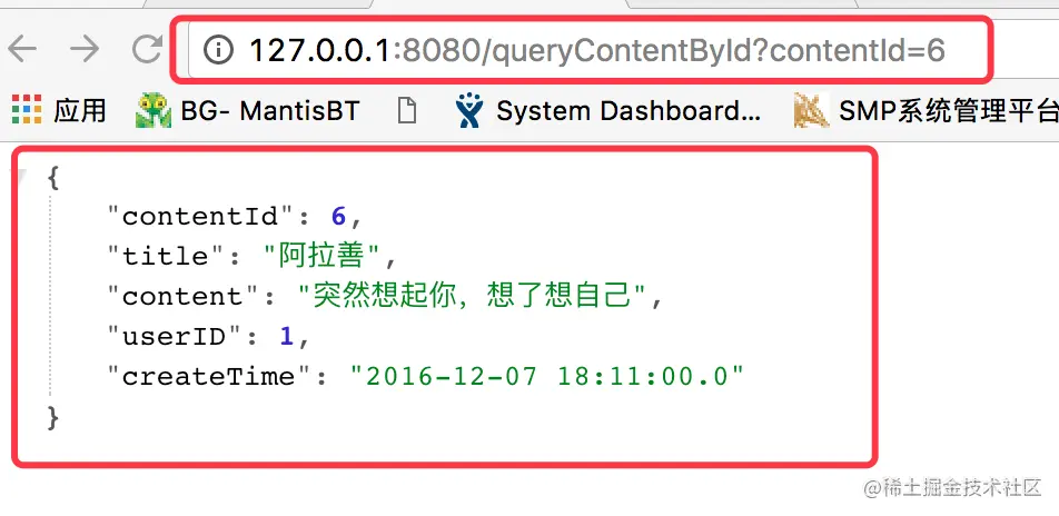 我们先访问/queryContentById这个路由,再访问这个路由时,我们要提供一个参数contentId。也就是用来查询数据的条件。下方截图中的结果就是我们对contentId=6的条件查询的结果。