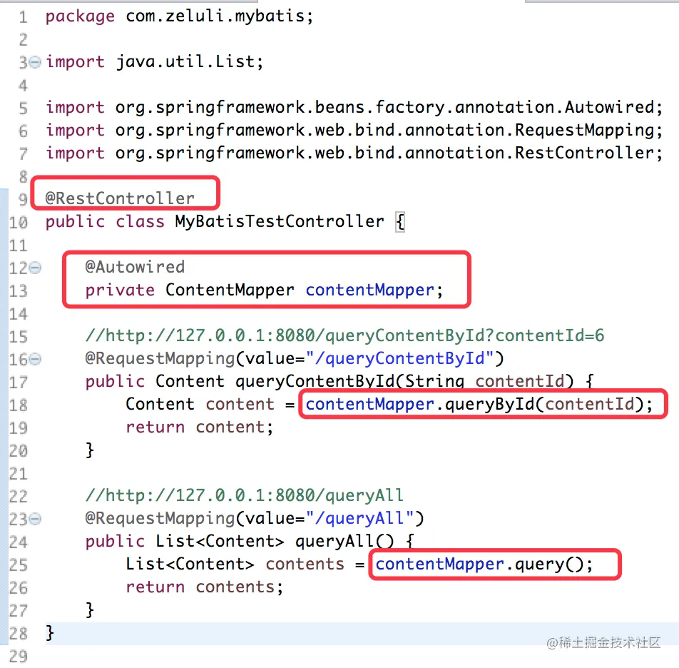 为了简便期间,我们就不创建DAO层了,就直接在Controller中来调用上述接口中的方法即可。下方这个MyBatisTestController就是我们创建的用来测试上述操作的测试控制器。当然我们将该控制器声明为@RestController以便我们对其进行测试。然后使用@Autowired注解注入ContentMapper类型的对象,我们可以通过该对象来操作上述接口中所对应的方法。queryContentById()方法,对应的是contentMapper中的queryById()方法,queryAll()方法对应的是Mapper中的query()方法,具体代码如下所示。