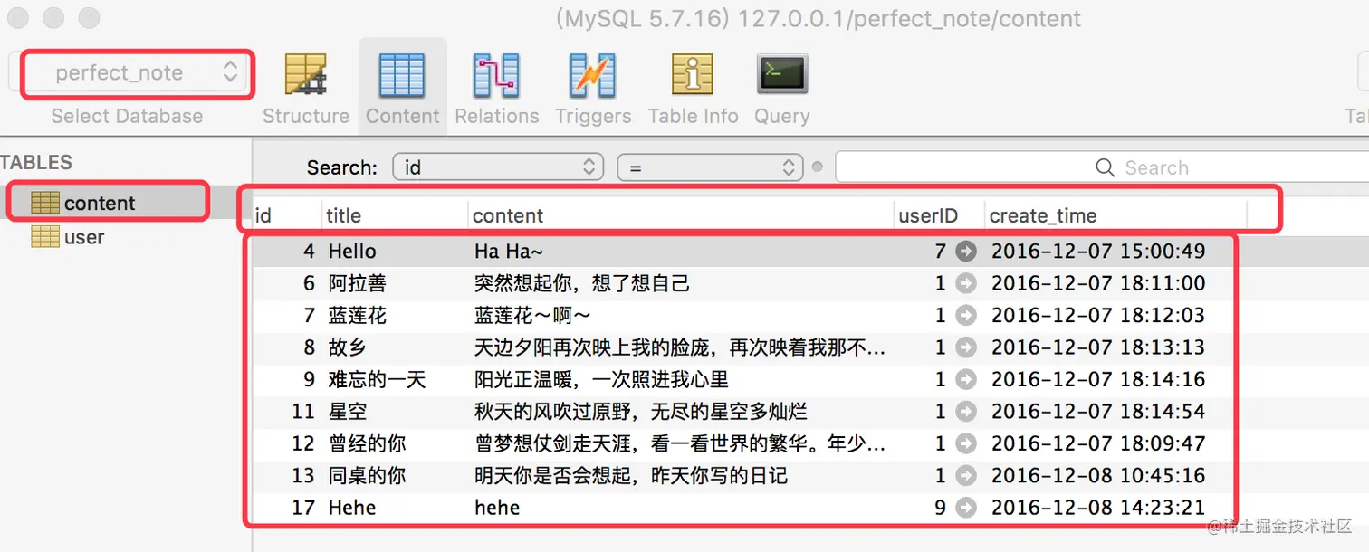 接下来我们就来创建数据库中的相应数据所要映射的数据Model类。接下来我们就来操作perfect_note数据库中的content表,如下所示。下方数据库及数据库中的数据是我们之前在聊Perfect框架时所使用的数据,本篇博客我们依然对该数据进行操作。