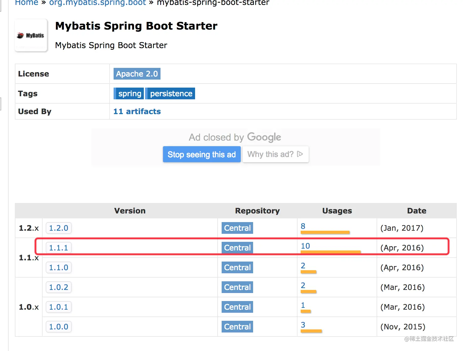 首先我们来看一下如何在Spring Boot中引入MyBatis。首先我们在mvnrepository.com/中找到Mybatis Spring Boot Starter相关的Mvn仓库连接。如下所示,从下方截图中,我们不难看出,目前MyBatis Spring Boot Starter的最新版本是1.2.0。不过本篇博客中我们使用的是1.1.1版本,因为我引入1.2.0后,我的SpringBoot工程根本启动不了,于是换成1.1.1版本就OK了。