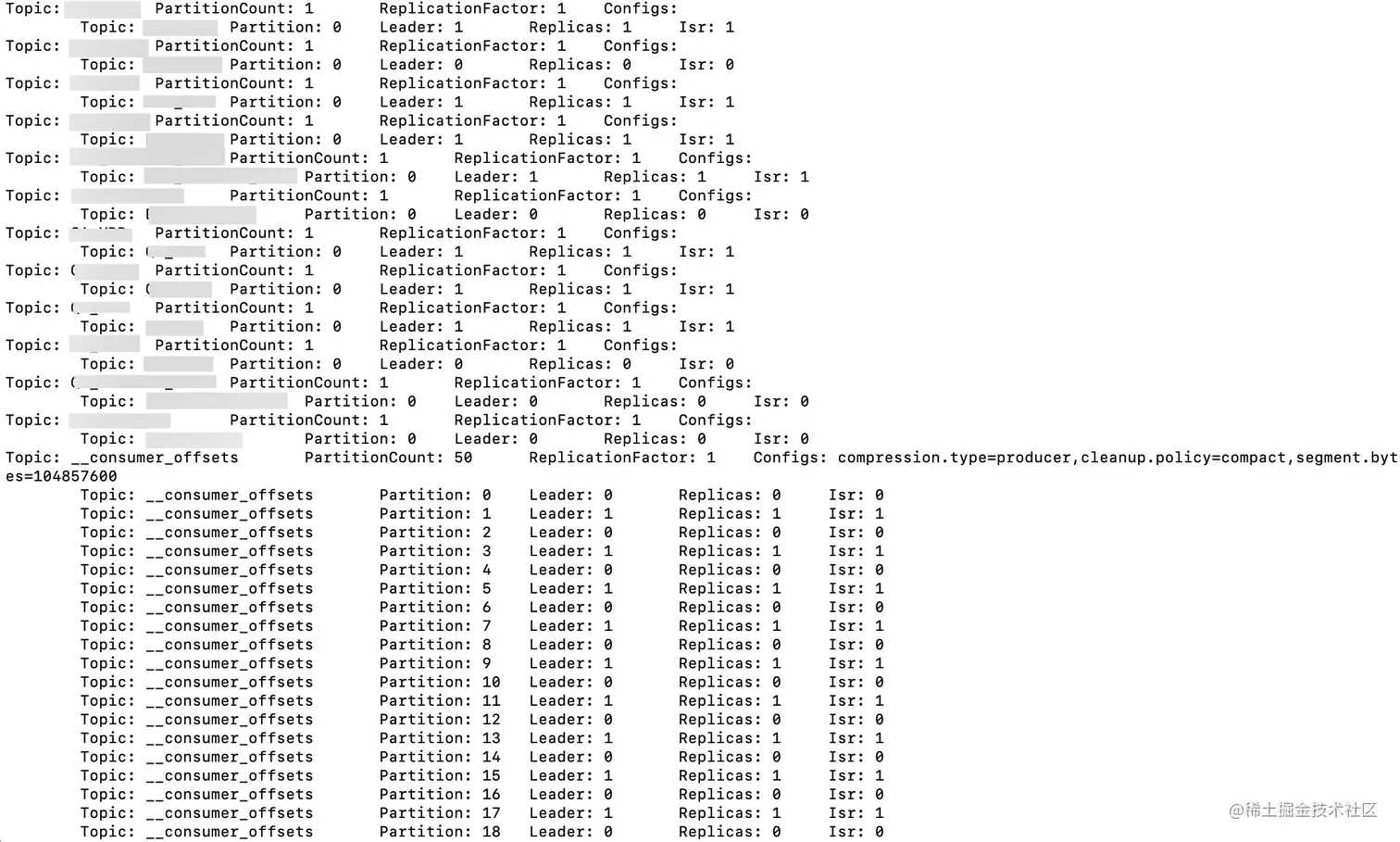 然后我们就可以获取到各个topic及其partition在kafka集群节点上的分布明细,具体的例子如下: