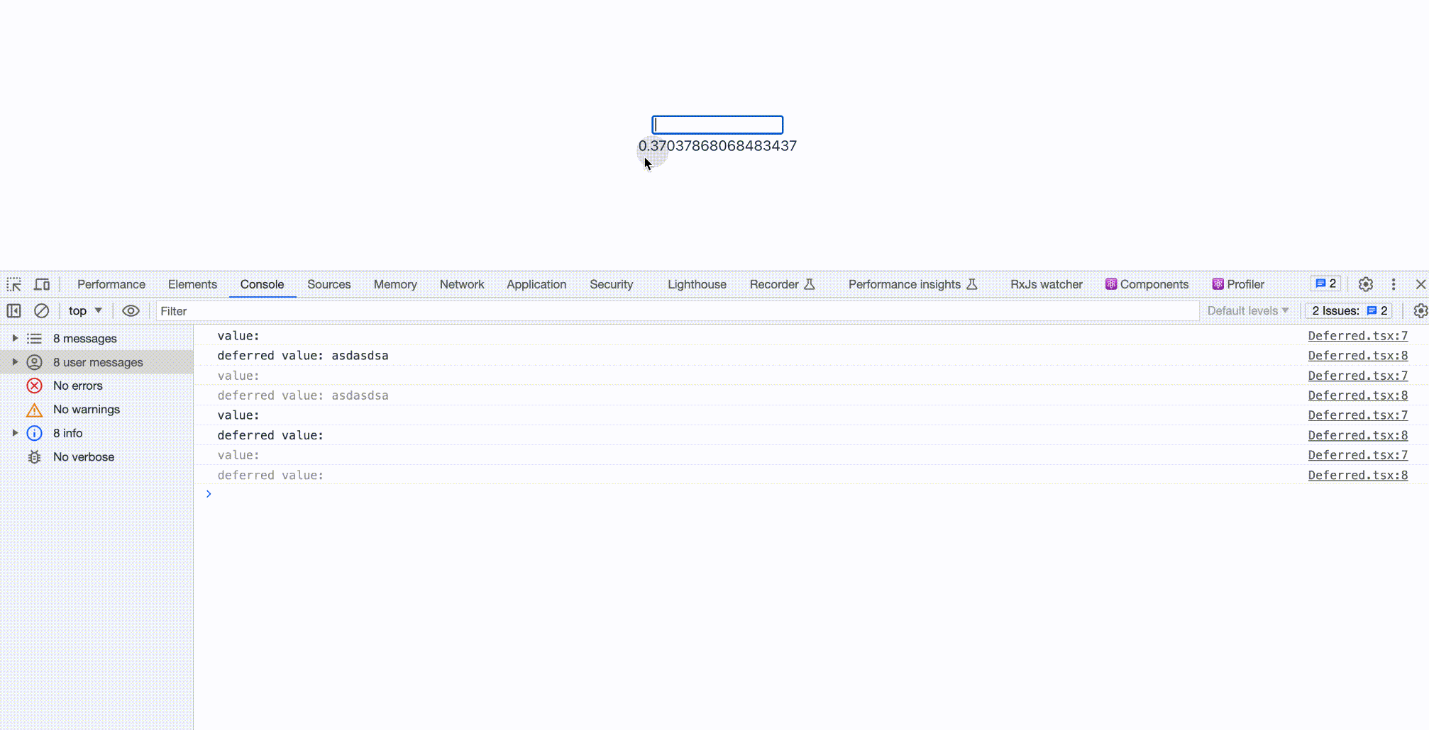 可以看到随着用户输入不再会渲染Suspense的fallback了。可以理解为用户的输入的优先级较高,因此input中的onChange会高优先级执行,导致了函数组件的重新执行,但是deferred由于被useDeferredValue包裹,因此会延迟更新,通过下面的动图可以看到每次输入都会引起组件的更新,但是并不会引起deferred的值的更新。当我们停止输入后最终deferred和value的值同步了。