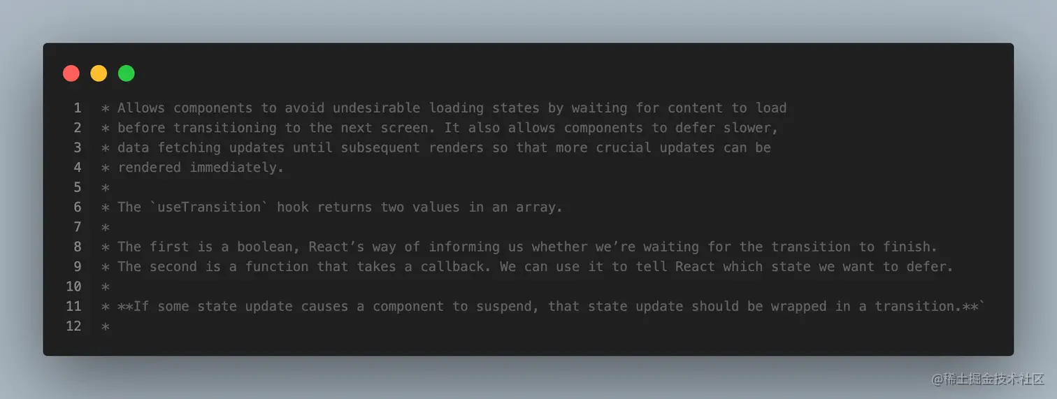 实际使用时setTransition则更加灵活。因为我们在使用useDeferredValue时,react帮我们决定了何时为这个deferred值附新值,但是我们可以通过setTransition来直接控制何时进行低优先级操作。而useDeferredValue的使用场景更多的是原值在组件中不可控,比如说我们上面的例子中子组件接受props,把props通过useDeferredValue进行包裹,因为props的控制权不在子组件中。