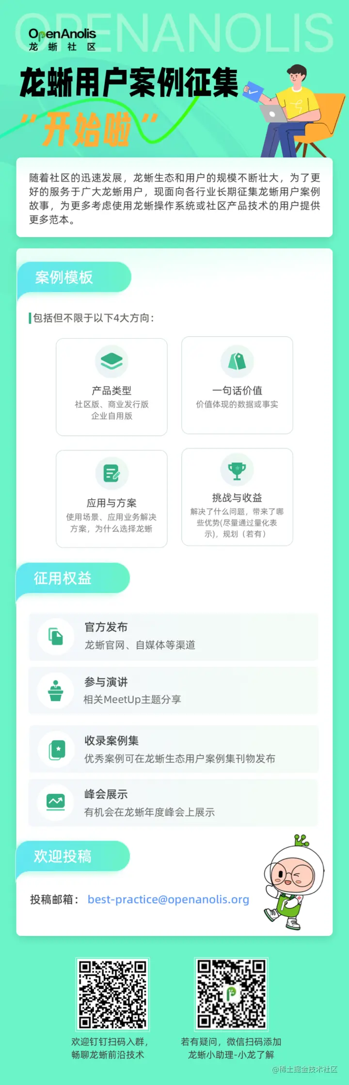 请将案例撰写好后投稿至社区邮箱 best-practice@openanolis.org ,社区审核通过后发布。欢迎各类企业用户、高校、个人创新创业项目投稿!如有问题可征询龙蜥社区小助理-小龙(openanolis_asis)。