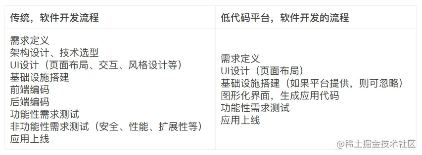 对比可以发现,低代码平台对比传统开发方式,在以下开发环节做了优化: