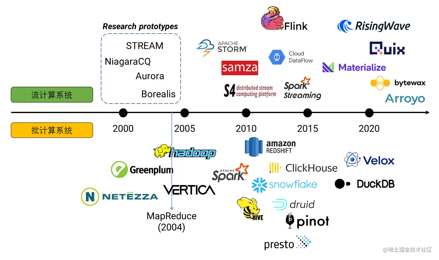 (上图为:批计算与流计算在本世纪发展历程。)