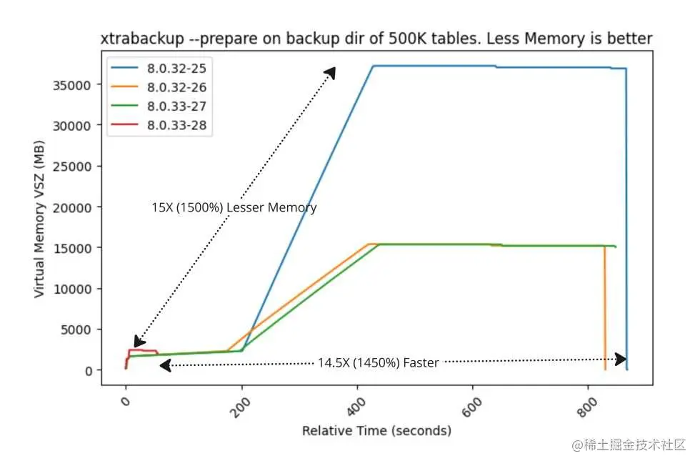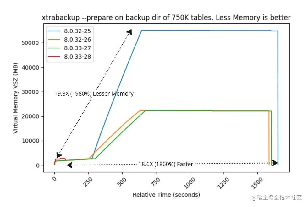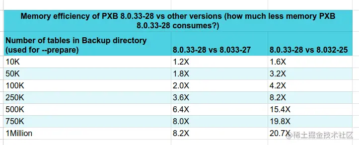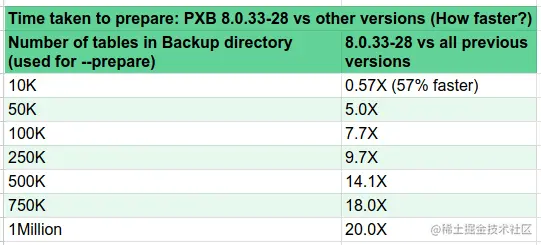在其他大小的备份目录上对 xtrabackup -prepare 进行基准测试,如 10K、50K、100K 和 250K 表。性能改进如下: