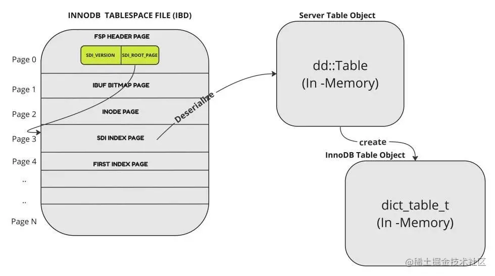 在服务器上初始化“数据字典”(DD)引擎和 DD 缓存后,存储引擎可以请求表定义。例如,InnoDB 根据也称为“se_private_id”的 table_id 请求表定义。