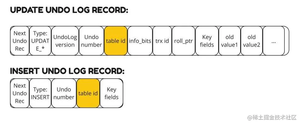 当服务器写入这些记录时,它不会与每个记录一起写入索引/表信息。它只将“table_id”写入作为 UNDO LOG 记录的一部分。 table_id 用于获取表架构。 从 Undo Log 记录中获取表架构和关键字段用于创建索引搜索元组(Key)。 此搜索元组(Key)用于查找要执行撤消操作的记录。
