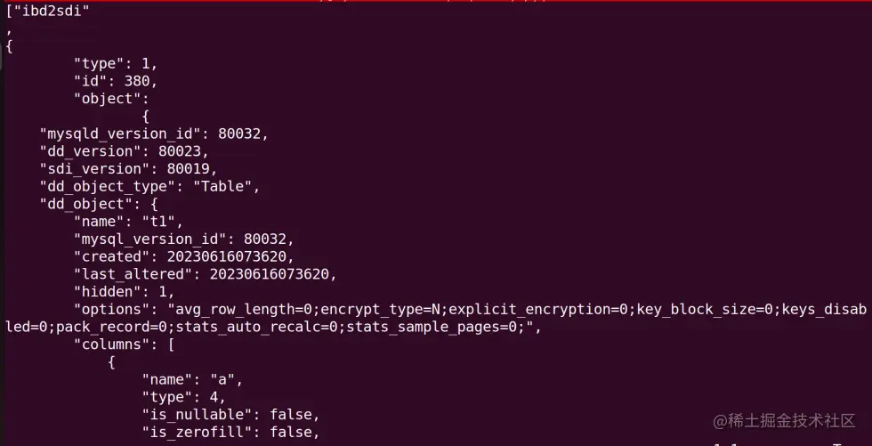 CREATE TABLE 语句在 test 目录中创建一个名为 t1.ibd 的文件。例如,mysql datadir/test/t1.ibd。 因此 t1.ibd 包含有关表结构(列、它们的类型、索引数量、索引中的列、外键等)的信息作为 SDI。 使用名为“ibd2sdi”的工具从 IBD 文件中提取 SDI。