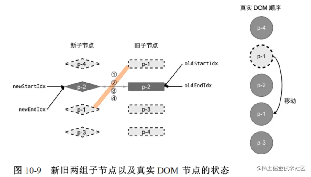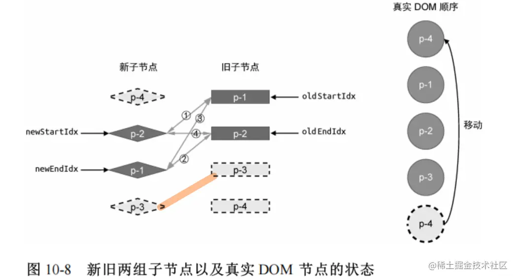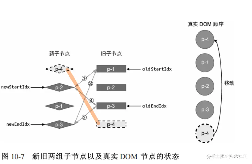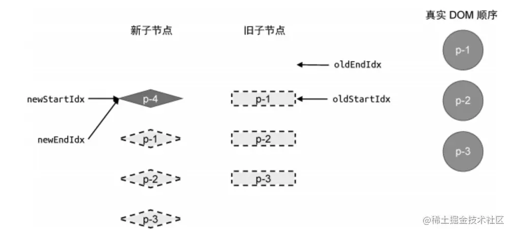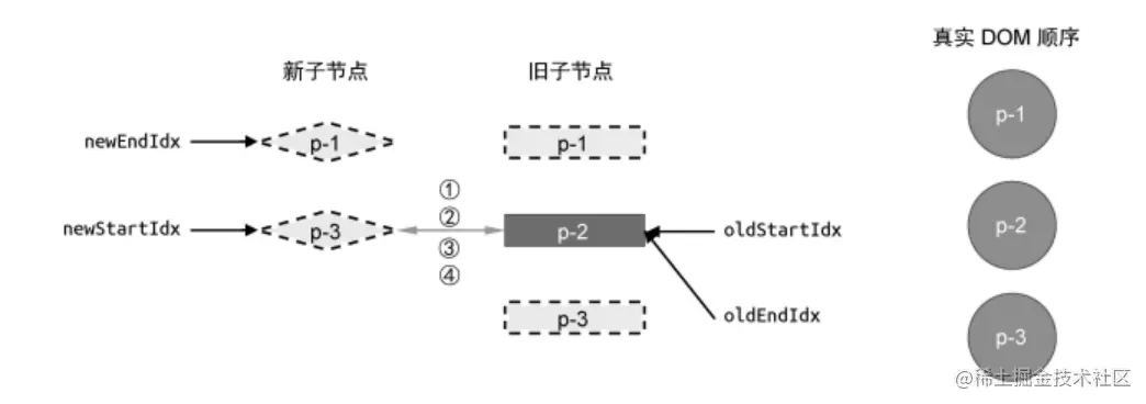 对于同样的更新场景,双端diff算法执行的dom移动操作次数更少。本质是双指针,分别用newStartIndex和newEndIndex指向新虚拟dom树的头尾节点,再用oldStartIndex和oldEndIndex指向旧虚拟dom树的头尾节点。