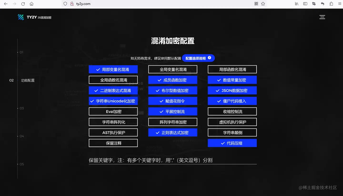 Ty2y是国内一个JavaScript混淆加密平台,可以实现在线JS代码混淆加密。它有多达20多项的参数配置。如下图所示:
