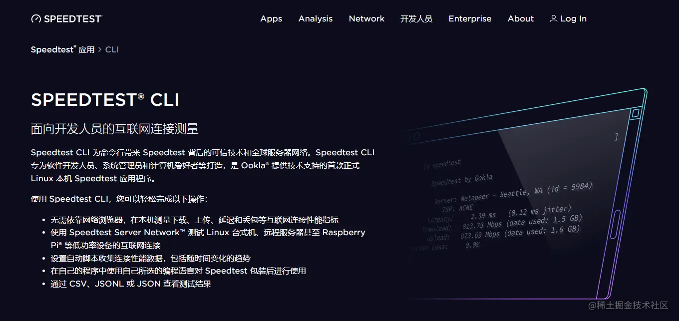 Speedtest CLI 为命令行带来 Speedtest 背后的可信技术和全球服务器网络。Speedtest CLI 专为软件开发人员、系统管理员和计算机爱好者等打造,是 Ookla® 提供技术支持的首款正式 Linux 本机 Speedtest 应用程序。