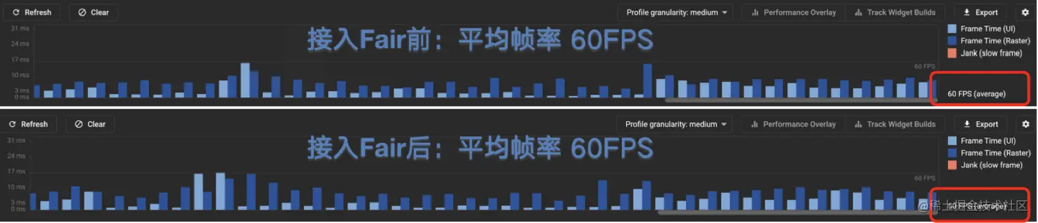 在性能方面,Fair 对性能影响很小,接入前后平均帧率无影响。由于解析和引擎的影响,内存和启动时间方面会略有增加,但在可接受范围内。