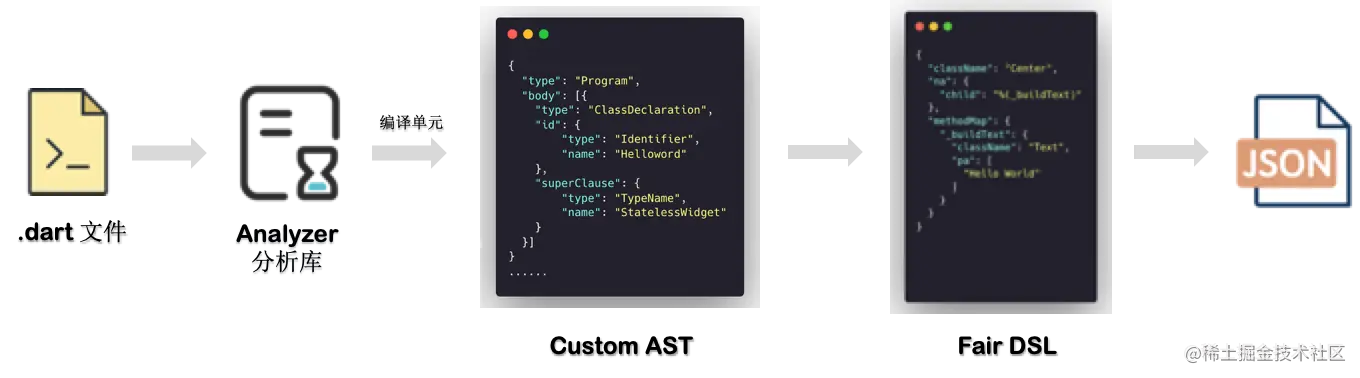 具体来说,Fair 会解析 Dart 代码,生成包含组件信息的 AST。然后根据 AST 生成 JSON 格式的 DSL,比如: