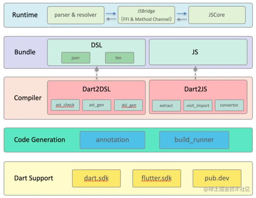 Fair 整体设计原则是要打造一个还是 Flutter 技术栈的、可通过市场审核的热更新方案。所以整体架构设计,是将 Dart 源文件转译成 DSL 通过下发 JSON 和 JS 来分别实现布局动态化和逻辑动态化。