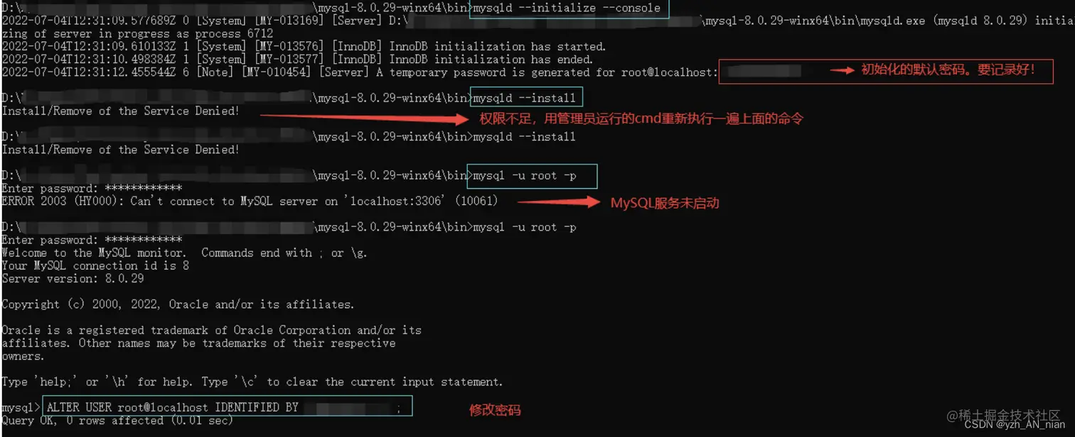 样,则代表安装成功!(注意:进行安装步骤时可能出现问题,若显示 The service already exists:表示该服务已经存在。出现这个问题,可以使用 sc delete mysql命令删除该服务之后重新进行安装即可)