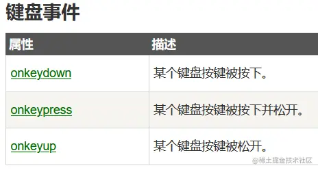 注意:在所有浏览器中 onkeypress 事件只能监听字母和数字,不能监听一些特殊按键(ALT、CTRL、SHIFT、ESC、箭头等)。监听一个用户是否按下按键请使用 onkeydown 事件,所有浏览器都支持 onkeydown 事件。