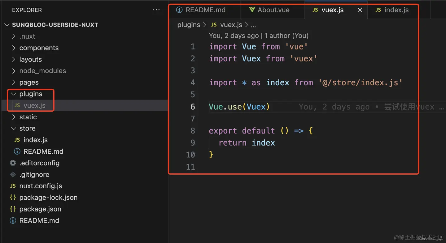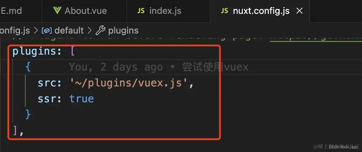 在plugins文件夹下,放一个vuex.js文件,并在nuxt.config.js中引入。