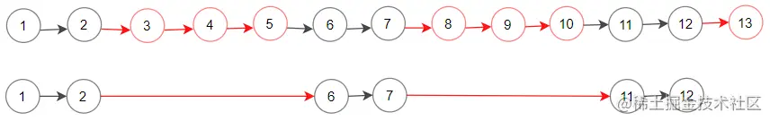 删除接下来的(n = 3)个结点(3 -> 4 -> 5), 在图中以红色结点表示.