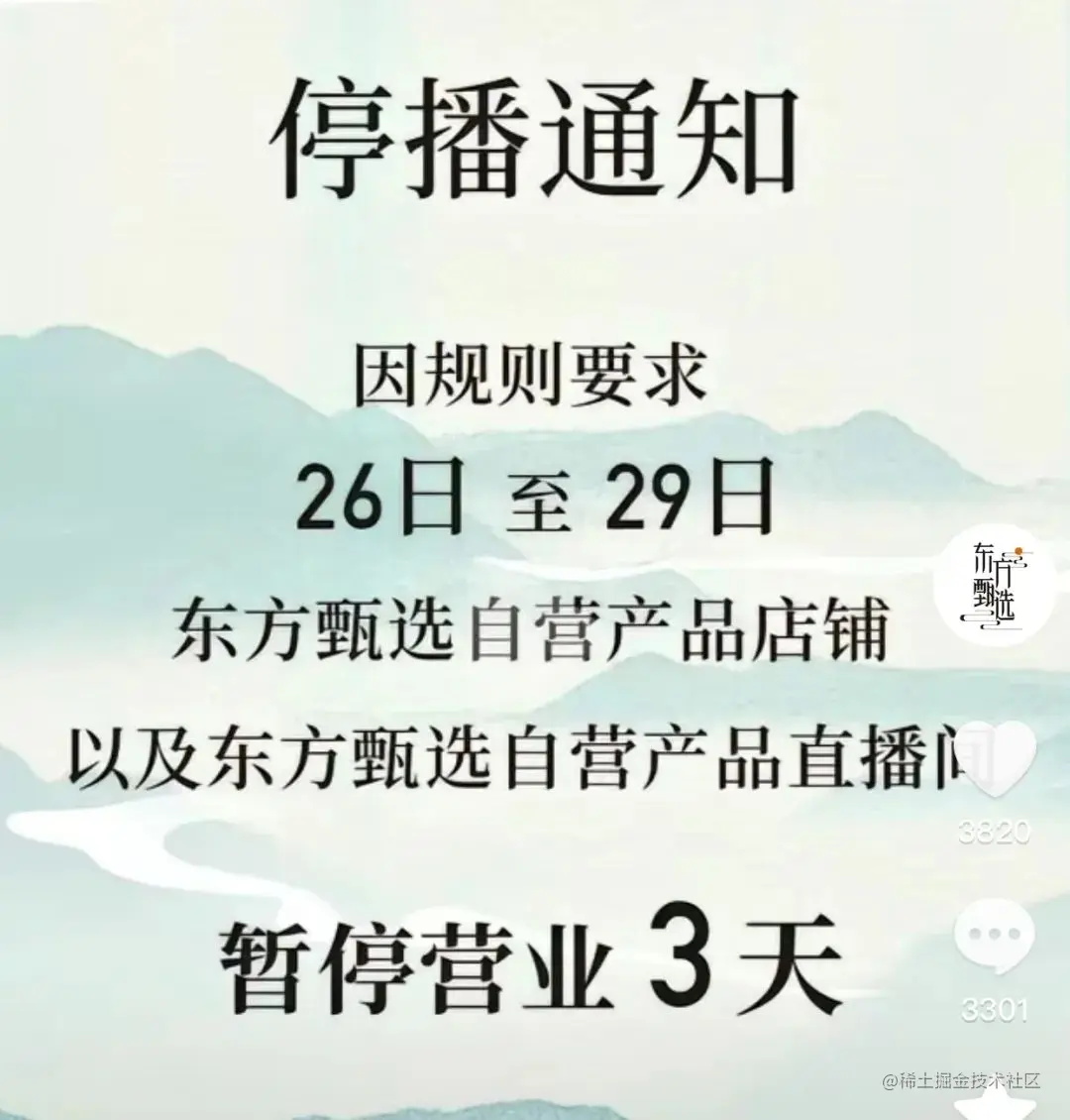 近日,“东方甄选自营产品”抖音直播间也发布了停播通知,称因规则要求,7月26日到29日,东方甄选自营产品店铺以及东方甄选自营产品直播间暂停营业3天。