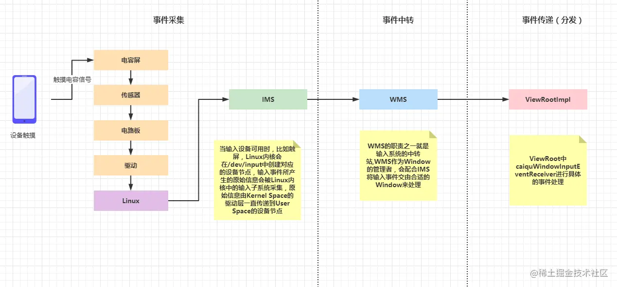 在Android中,Touch事件的分发分服务端和应用端。在服务端由WindowManagerService(借助InputManagerService)负责采集和分发的,在应用端则是由ViewRootImpl(内部有一个mView变量指向View树的根,负责控制View树的UI绘制和事件消息的分发)负责分发的。