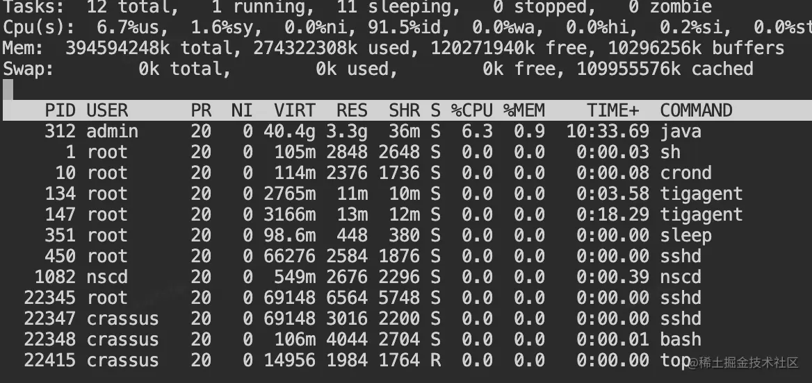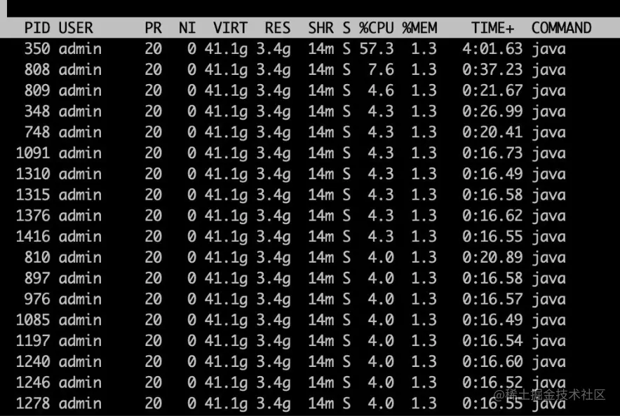 由于刚一开始压测,容器cpu就飙升到了100%,所以需要先定位cpu使用率问题,找出使用cpu最高的几个进程。可以通过top命令查找进程ID,发现正是压测的Java应用进程ID;然后在定位该金晨曦cpu使用率最高的线程,可以通过top -p 进程ID -H 命令显示该进程下的线程使用cpu信息。