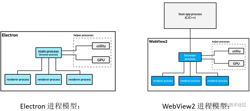 - Electron 是支持两种不同的沙盒机制,一种是 Render Prcoess 不限制,可以通过 NodeJS 任意与原生API打交道,另一个是限制 Render Process 只能渲染展现网页,不能和原生系统打交道。而 WebView2 只有一种模式,就是开启安全沙盒机制。