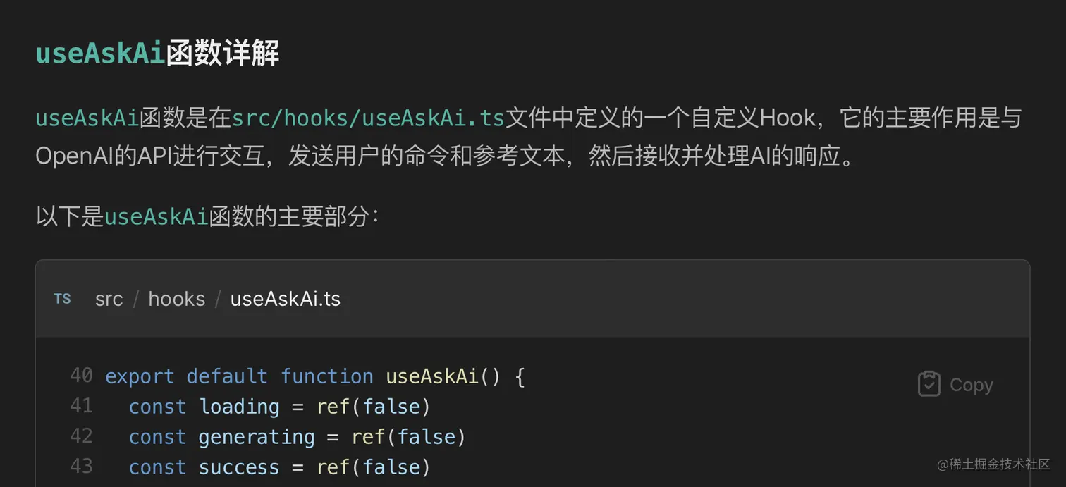 那么接下来,我们让bloop详细解释useAskAi方法的作用就能了解Webpilot的实现原理: