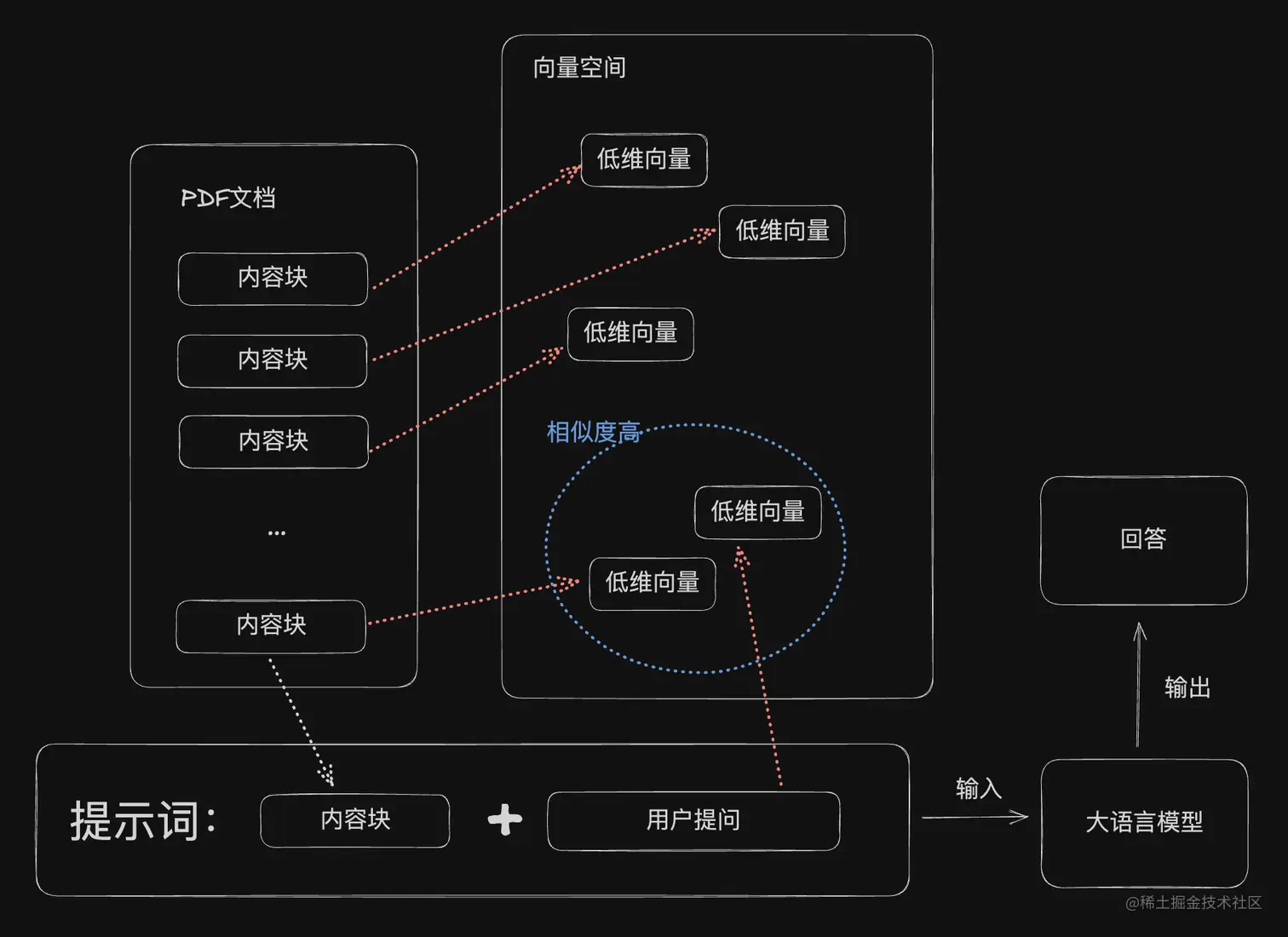 文档动辄几百页,GPT一次性能够接收的token有限,他是如何实现就用户提问,在全文档中检索答案呢?原理大体可以概括为: