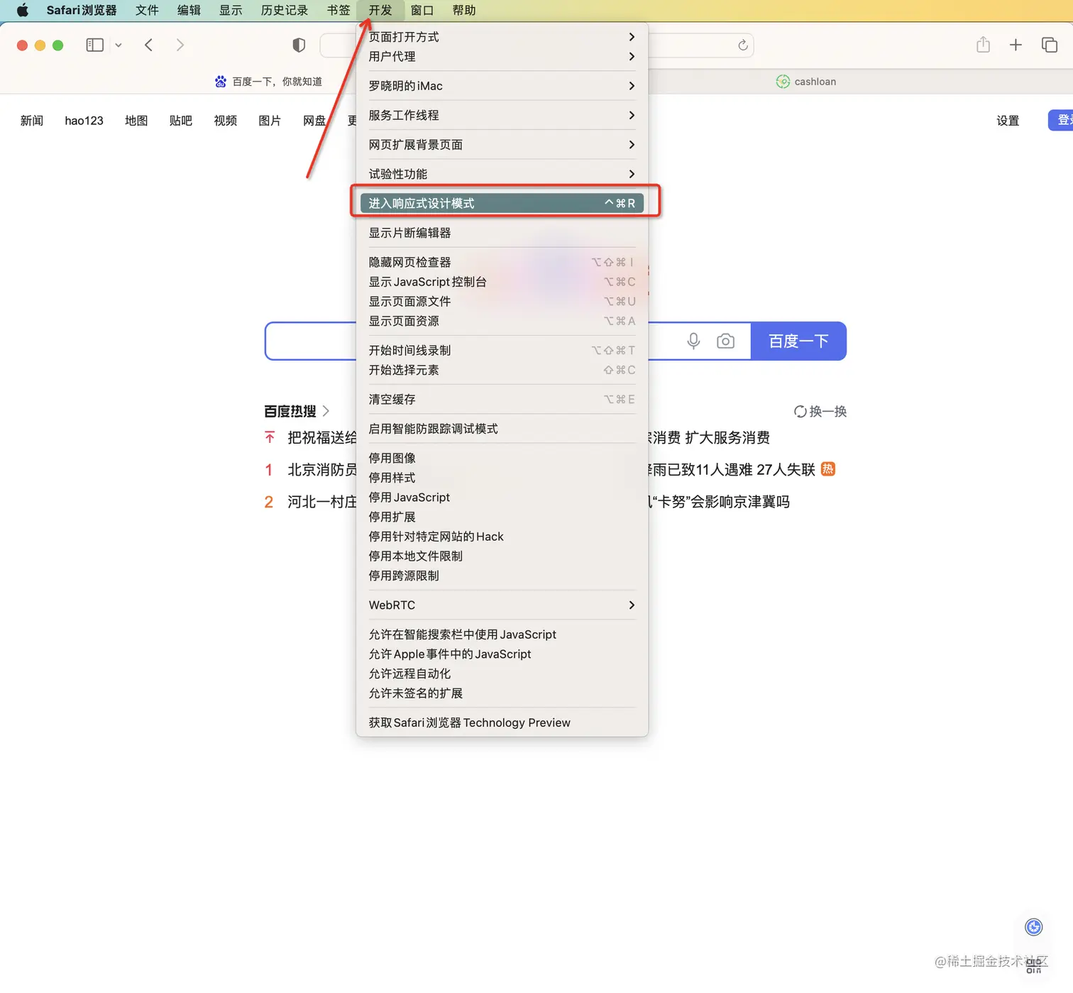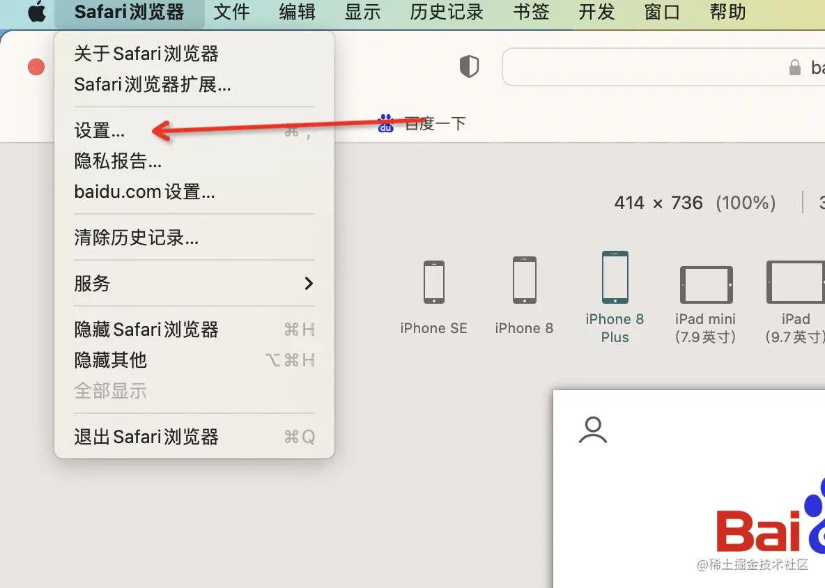 Safari 模拟 iphone 设备 Outsider爱学习 2023-08-01 318 阅读1分钟 如果在菜单栏没有找到“开发”选项;通过safaris 浏览器-> 打开设置 -> 高级 -> 勾选在菜单栏中展示“开发”