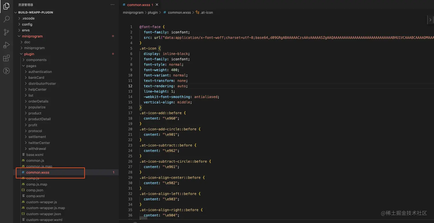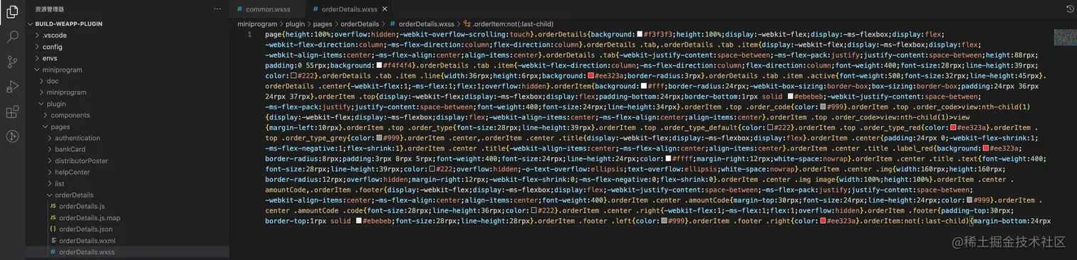 同时打开页面的打包文件可以发现,样式只是被提取到了common.wxss中,但是并没有在页面中进行引用
