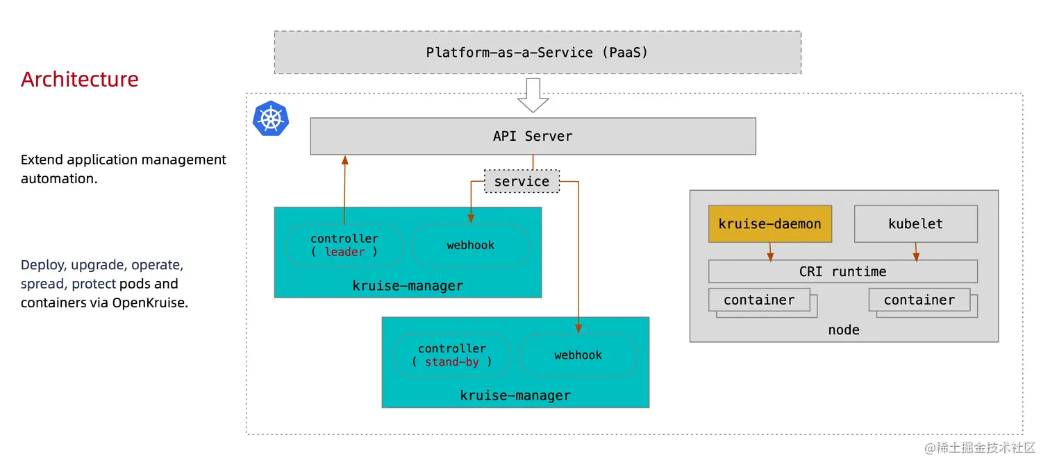 由上图可以看到:kruise-daemon 是部署在 Slave 节点的组件,其职能与 kubelet 类似,都是负责管理容器的生命周期,从 OpenKruise 的职能定位上来看,kruise-daemon 起到了增强 kubelet 的作用。