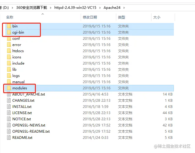 第五步、将下载到的httpd-2.4.39-win32-VC15.zip压缩包解压,把里面的bin、cgi-bin、modules文件夹复制,替换你原来Apache目录下的文件