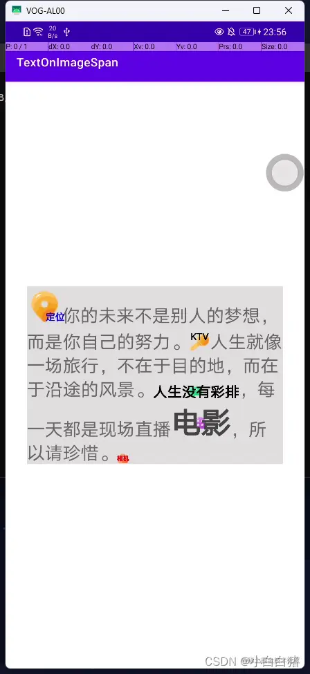 - 重写了getSize方法,根据设置的文本与图像之间的最大宽高计算出span最终的尺寸。重写了draw方法,修改了原有的部分图片绘制逻辑,然后再加入了文本的绘制逻辑。