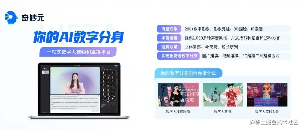 AI数字分身「奇妙元」是融合了“视频生成”和“虚拟直播”的一站式解决方案,可以大幅提升用户的工作效率。