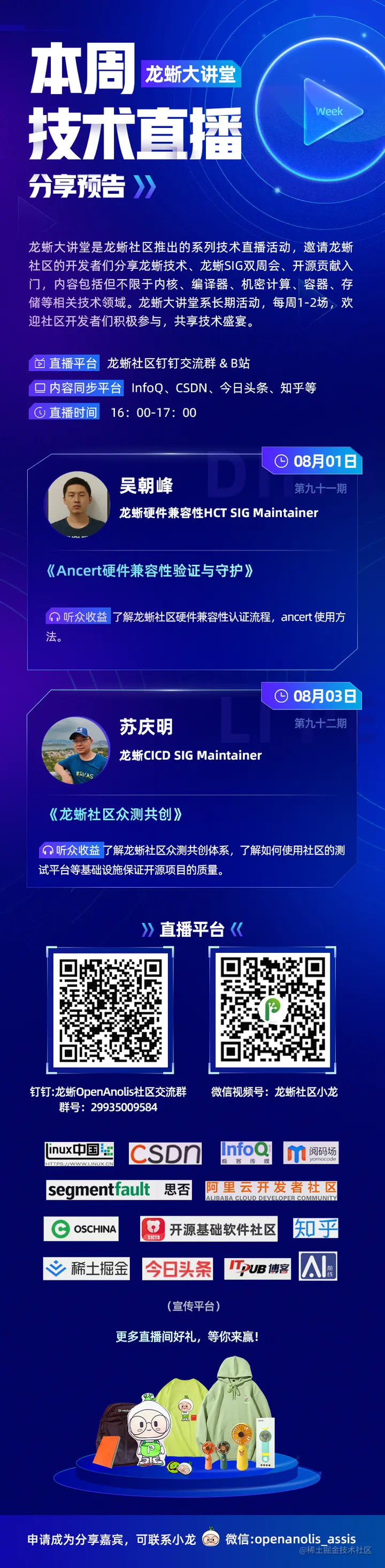 本周「龙蜥大讲堂」预告来啦!我们邀请了龙蜥硬件兼容性 SIG Maintainer 吴朝峰分享《Ancert 硬件兼容性验证与守护》、 龙蜥 QA SIG Contributor 苏庆明做《龙蜥社区众测共创》主题演讲,精彩多多,快来扫码入群,预定前排小板凳观看直播!