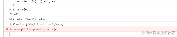 可以看出,由于finally中还有return,所以覆盖了catch中的return,这样就导致了b.catch中的错误没有传递出来,所以控制台报错了