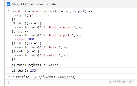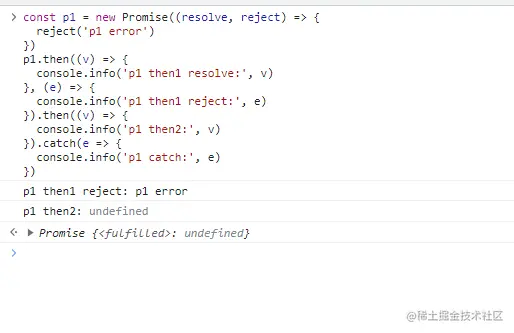 console.info('p1 then1 reject:', e) //输出