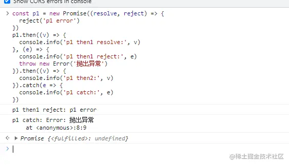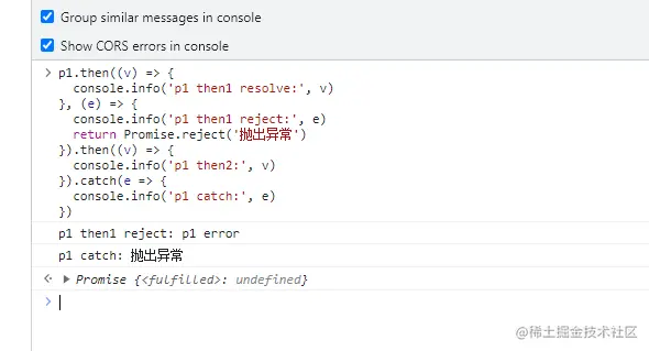 这里throw new Error()与return Promise.reject('抛出异常')效果一样,都是抛出错误,下面的p1 catch:会捕获到,不过两者的输出的内容还是不一样的,Error是一个错误对象,输出如上图,Promise.reject('抛出异常')输出的是一个字符串,输出效果如下图