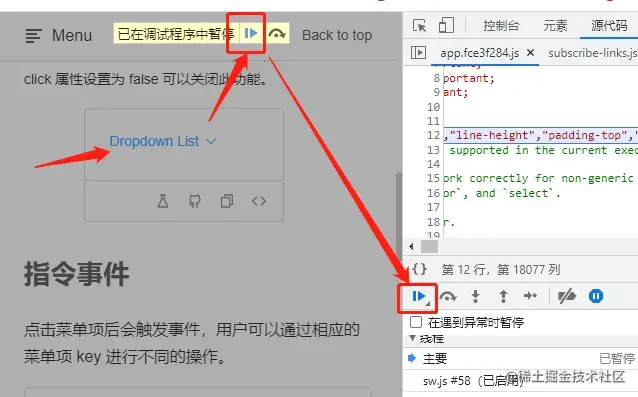 - 当鼠标移入页面元素,出现断点调试后,点击下图中方框内的按钮(任意一个),继续执行,直到出现下拉框为止。