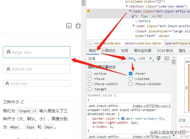 使用控制台调试器中的 :hov 方式模拟鼠标hover