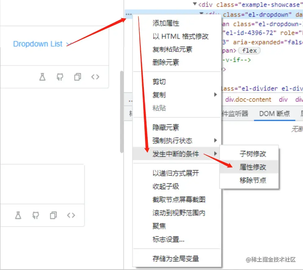 - 点击上图红框中的 点点点 , 或者旁边空白地方点击鼠标右键。点击 发生中断的条件 -> 属性修改。(选择完成后,三个点会变成一个蓝色的断点标志)